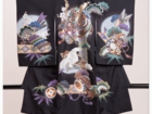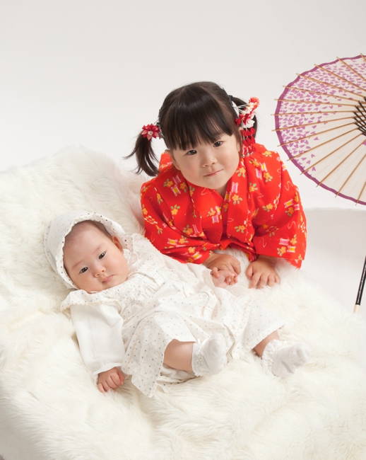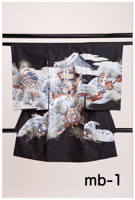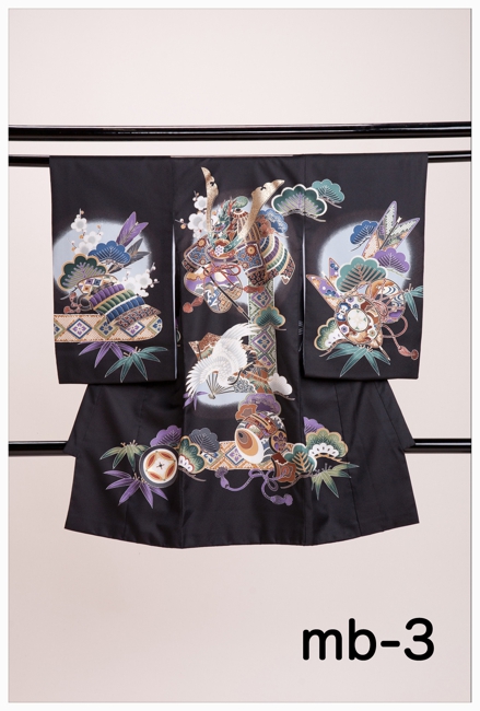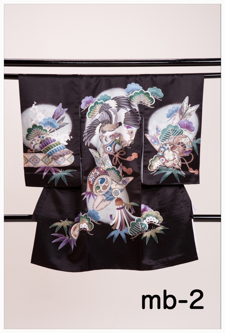 ■お宮参り用男女一種類ずつ黒と赤のスタンダードなお衣装置いてあります。