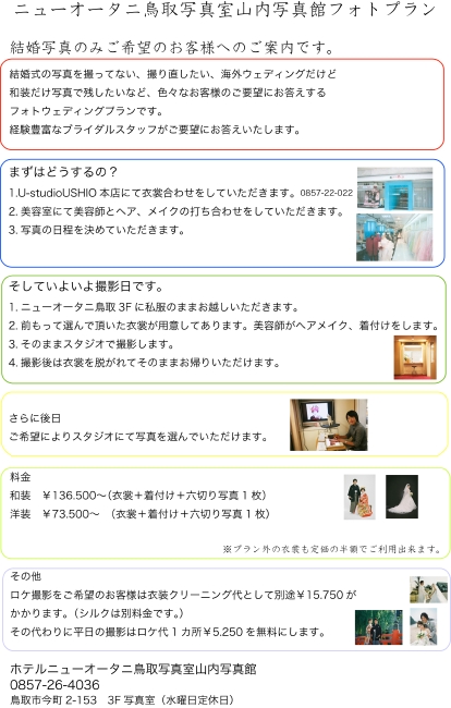 ニューオータニ写真室はニューオータニ鳥取の写真撮影部門ですので 衣装、美容はホテル指定の衣装部門、美容部門をご利用いただく形に なります。 百戦錬磨のスタッフがお手伝いいたします。